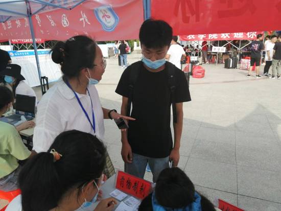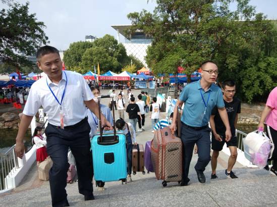 学院老师也加入迎新队伍,在报道现场帮助新生解决困难,同时亲力亲为帮新生搬运行李,与新生进行友好的交谈。
