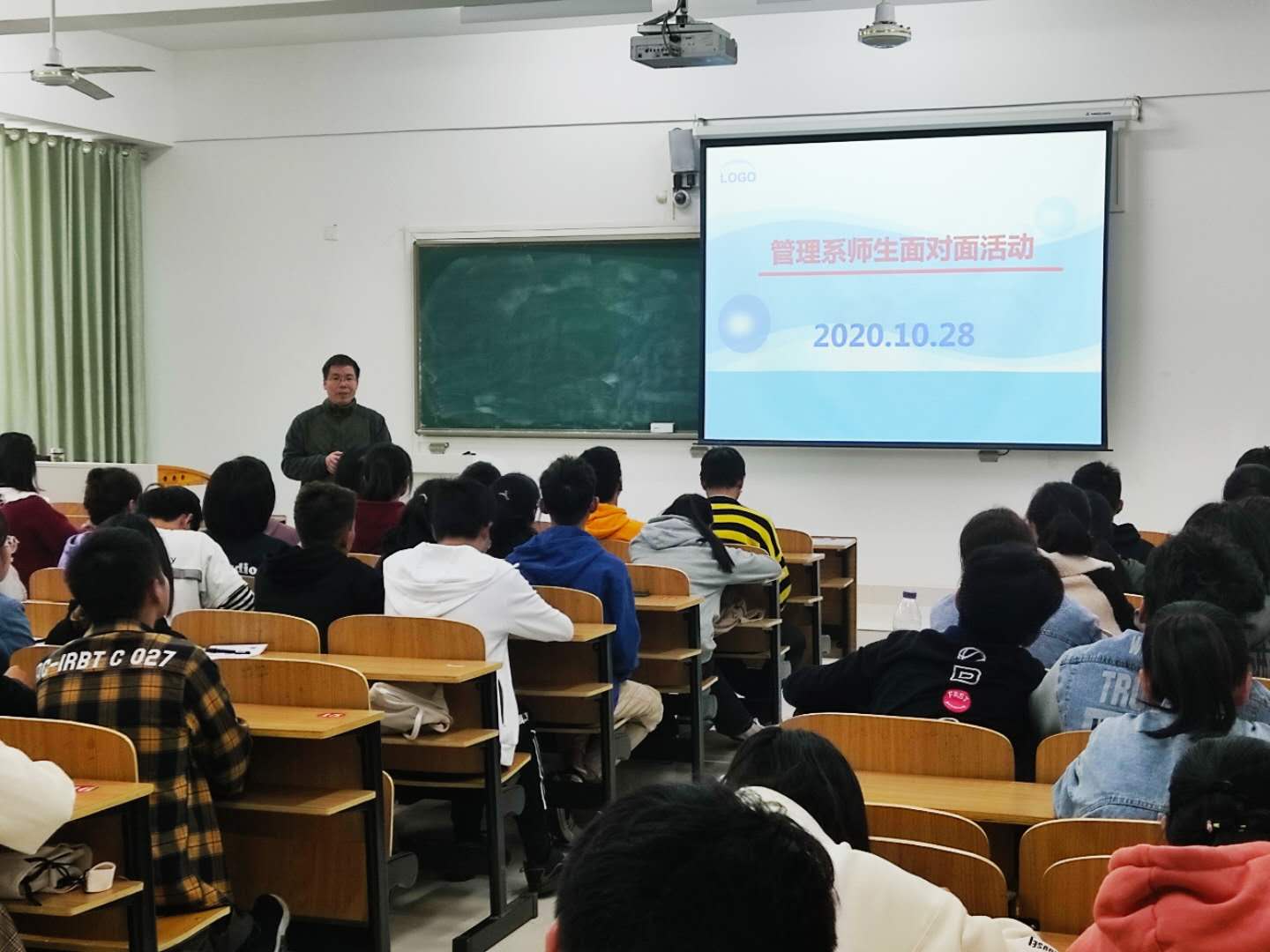 为帮助2020级新同学更好地融入大学生活,树立大学成长成才目标,及时有效解决同学们在日常学习生活中的难题和疑惑,10月28日,管理教工党支部(管理系)积极为学院新生开展了我与2020级新生面对面交流活动。交流会由学院党总支委员、管理系主任、管理教工支部书记、教授程业炳老师主持,2020级工商管理、物流管理、质量管理工程专业的全体学生参加。