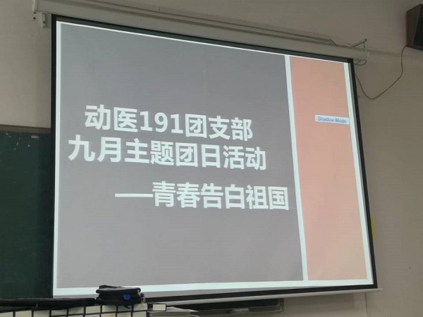 动物医学183团支部在求知楼A404展开了以“爱国,你我共参与”为主题的活动,通过唱团歌、观看视频的形式为祖国献上祝福,团支书孙娜通过分享自己身边的爱国主义先进事例,用身边榜样的真人真事、真情实感来激发发同学们对爱国情怀,引起青年学生们的情感共鸣和价值认同。