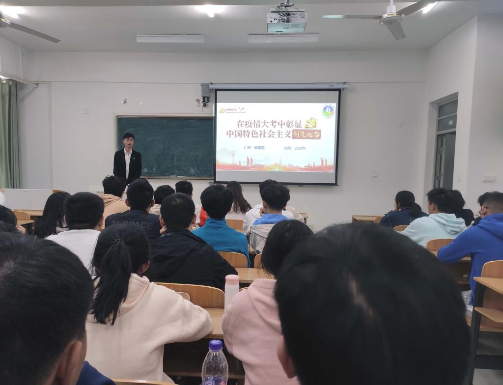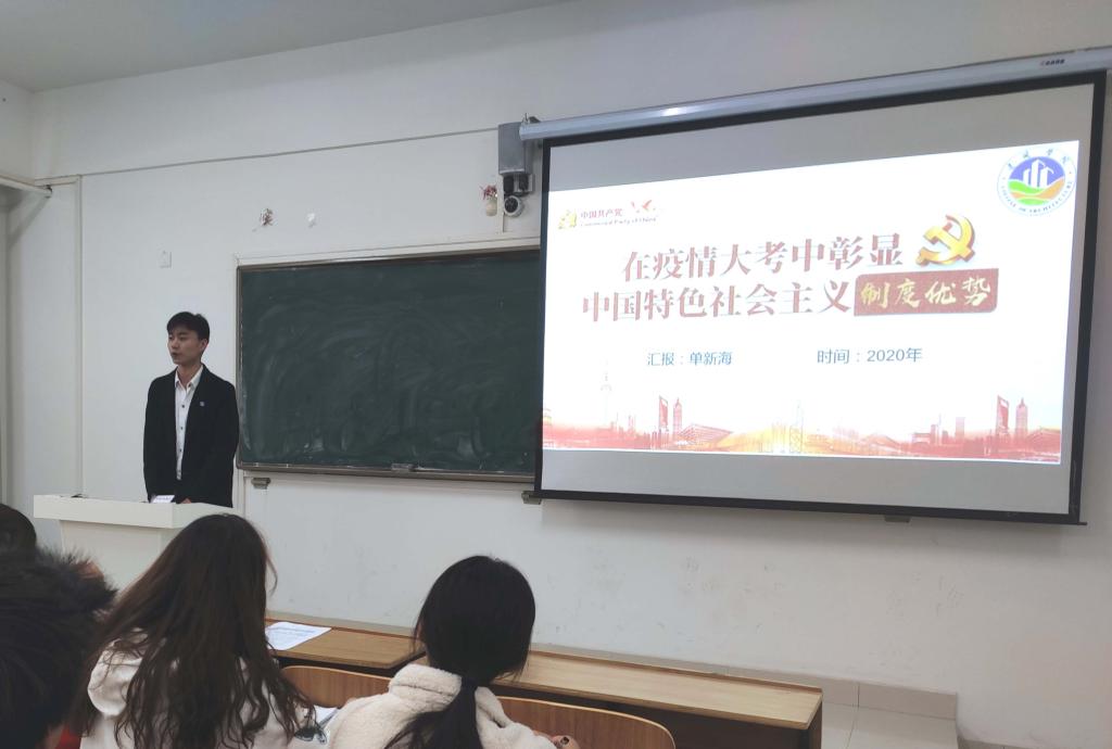 为深入学习宣传贯彻习近平总书记重要讲话精神和全国学联二十七大会议精神,进一步引导青年学生坚定跟党走中国特色社会主义道路的理想信念,11月4日,建筑学院在致知楼C306教室开展“绽放战疫青春 坚定制度自信”青春思政课。本次青春思政课由建筑学院学生党员、校十佳大学生、校抗疫先进个人单新海主讲。建筑学院辅导员沈德艳,学生党员、发展对象、入党积极分子以及2019级、2020级班长、团支书出席了思政课。