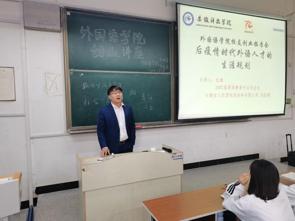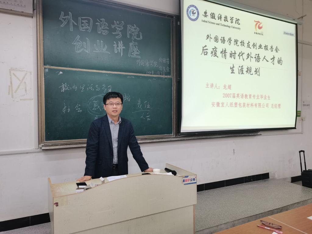 11月7日下午,外国语学院优秀校友创业报告会在求知楼A座205教室举行。本次会议邀请06届英语专业毕业生、上海轶歌实业有限公司董事长陈从彬,06届英语专业毕业生、诺亚财富绍兴分公司总经理梅杰,09届英语专业毕业生、安徽宜人纸塑包装材料有限公司总经理龙超,学院党总支秘书张海亮、分团委书记陈慧中出席, 20级全体新生参加本次讲座。