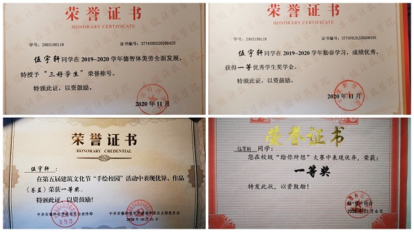 伍宇轩,男,安徽当涂人,入党积极分子,建筑学院2019级建筑学专业学生,现任建筑学191班班长,学校书美协会行楷组助理,曾获校“三好学生”称号、校一等优秀学生奖学金、建筑学院第五届建筑文化节“手绘校园”一等奖和校书美协会书画知识竞赛团体赛一等奖、校“绘你所想”大赛一等奖等荣誉。