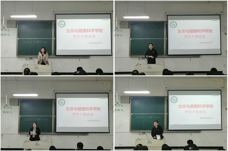 4月27日中午,生命与健康科学学院于求知楼A101教室召开学生干部会议。学院党委副书记彭丽萍,党政办公室主任王传林,正科级辅导员兼正科级组织员邓艳萍,团委副书记姜毅以及副科级辅导员刘国祥出席会议,各班级班长、团支部书记、学习委员,院团委、学生会、易班副部以上成员参加本次会议。会议由姜毅主持。