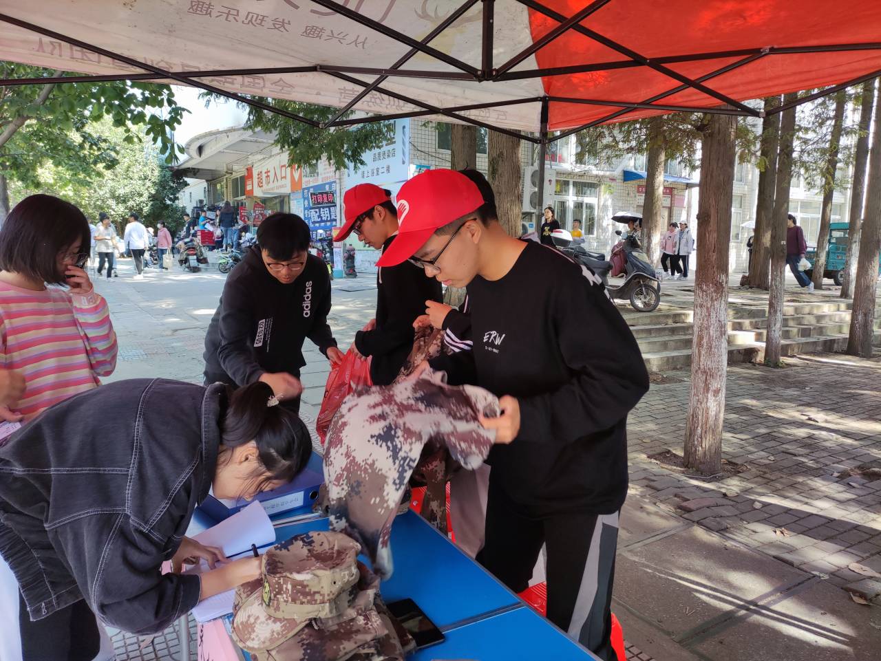 在捐献现场我们可以看到,我们的工作人员顶着炎炎烈日,耐心的接待每一位前来捐赠的新生,微暖的语气、甜蜜的笑容、细心的动作体现着志愿服务精神。