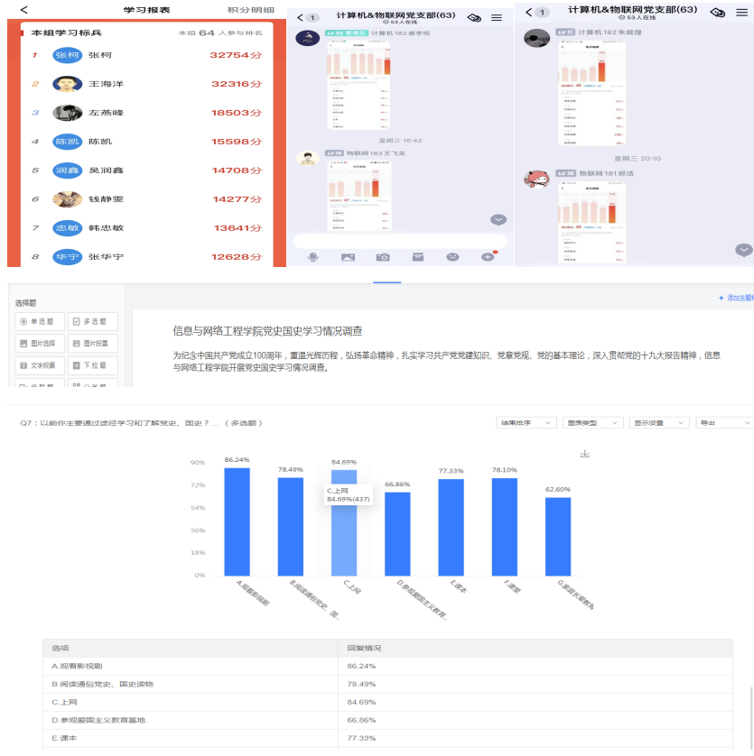 各学生党支部充分利用“学习强国”平台强大的学习功能,开展学生党史学习教育,敦促各支部学生党员加强自我学习,及时在党支部QQ群中分享优秀的党史学习教育资料,并在每周三党支部的线上学习交流时,定期发送“学习强国”学习周报,交流党史学习教育的心得感悟。