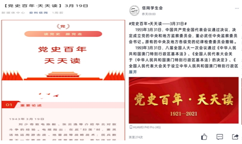 在微信平台上,充分利用学院“安科信网”微信公众号,开设《党史百年-天天读》专栏,分设“读党史-跟党走”专区;在“信息与网络工程学院分团委”官方QQ上设置“我的团 我的党”“团团来分享”特色栏目,分享党史学习教育相关内容,采取图文并茂的方式,打造弘扬红色文化、传承红色基因的网络媒体新阵地,充分展现中国共产党百年辉煌党史,再现中国共产党带领中国人民艰苦奋斗的光辉历程,极大地激发了同学们对党史学习的热情,各平台线上推送的党史学习资料,平均日阅读量达到近300次。