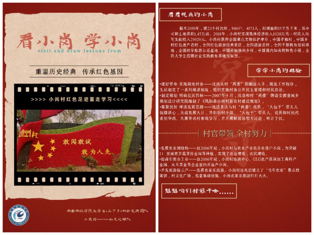 2021年7月22日,安徽科技学院人文学院暑期“三下乡”社会实践团队,“小岗村——红色之眼”队于凤阳集结完成。团队实践目的在于从小岗村的村史以及建设现状中汲取先进经验,并将之传播到其他乡村,做到学史致用、以学促行。