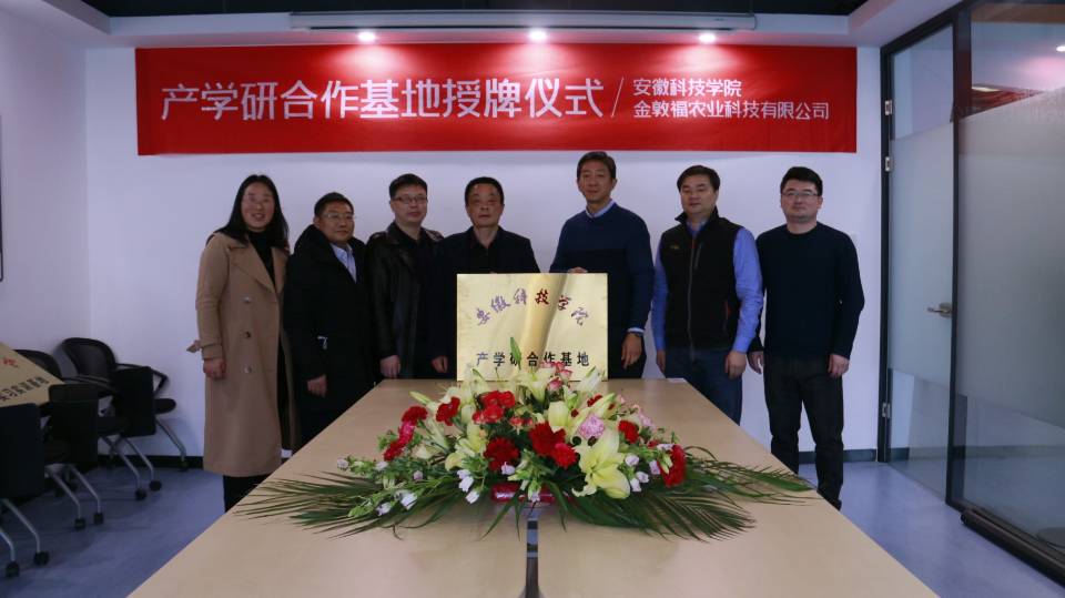 19日上午,崔广荣一行来到安徽金敦福农业科技有限公司。与公司总经理陈栋、副总经理邓大鹏、杨仰等就公司人才需求、共建研究生培养基地、产学研深入合作等方面进行了洽谈。陈栋首先介绍了安徽金敦福农业科技有限公司的概况,并表达了在杂草防除、生物防治等领域开展深度产学研合作的意愿,陈栋等还对我校植物保护专业人才培养方案的修订提出了很好的建议,并初步确定了建立校外实习实训基地的实施内容、方式和时间等。双方签订了校企共建应用型课程《植物化学保护》、《植物病虫害生物防治》的协议,并进行了安徽科技学院产学研合作基地的授牌。
