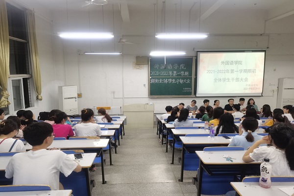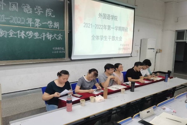 8月29日晚19:00,外国语学院在求A106教室召开学期初全体学生干部大会。学院党委书记蔡为青、院长陈德用、副院长刘萍、党委副书记张海亮以及全体辅导员出席会议,学院全体学生干部参加会议,会议由张海亮主持。