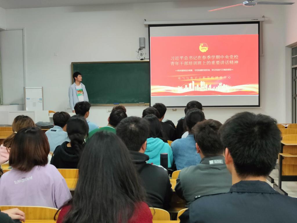 为坚定理想信念,发扬担当和斗争精神,电气与电子工程学院团委于3月16日下午18时在致知楼B108开展学习“习近平总书记在中央党校(国家行政学院)中青年干部培训班开班式上的重要讲话精神”主题团日活动。2020、2021级团支书参加了本次活动。活动由团委组织部、电子信息工程214班团支书汪世豪主持。
