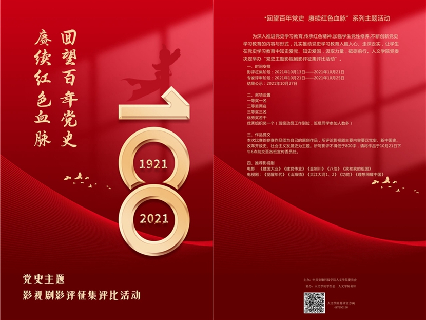 为庆祝建党100周年,回顾中国共产党波澜壮阔的光辉历程,深入学习贯彻习近平新时代中国特色社会主义思想,贯彻落实习近平总书记在党史学习教育动员大会上的讲话精神,10月13至29日,人文学院开展“回望百年党史,赓续红色血脉”党史学习教育影评活动。
