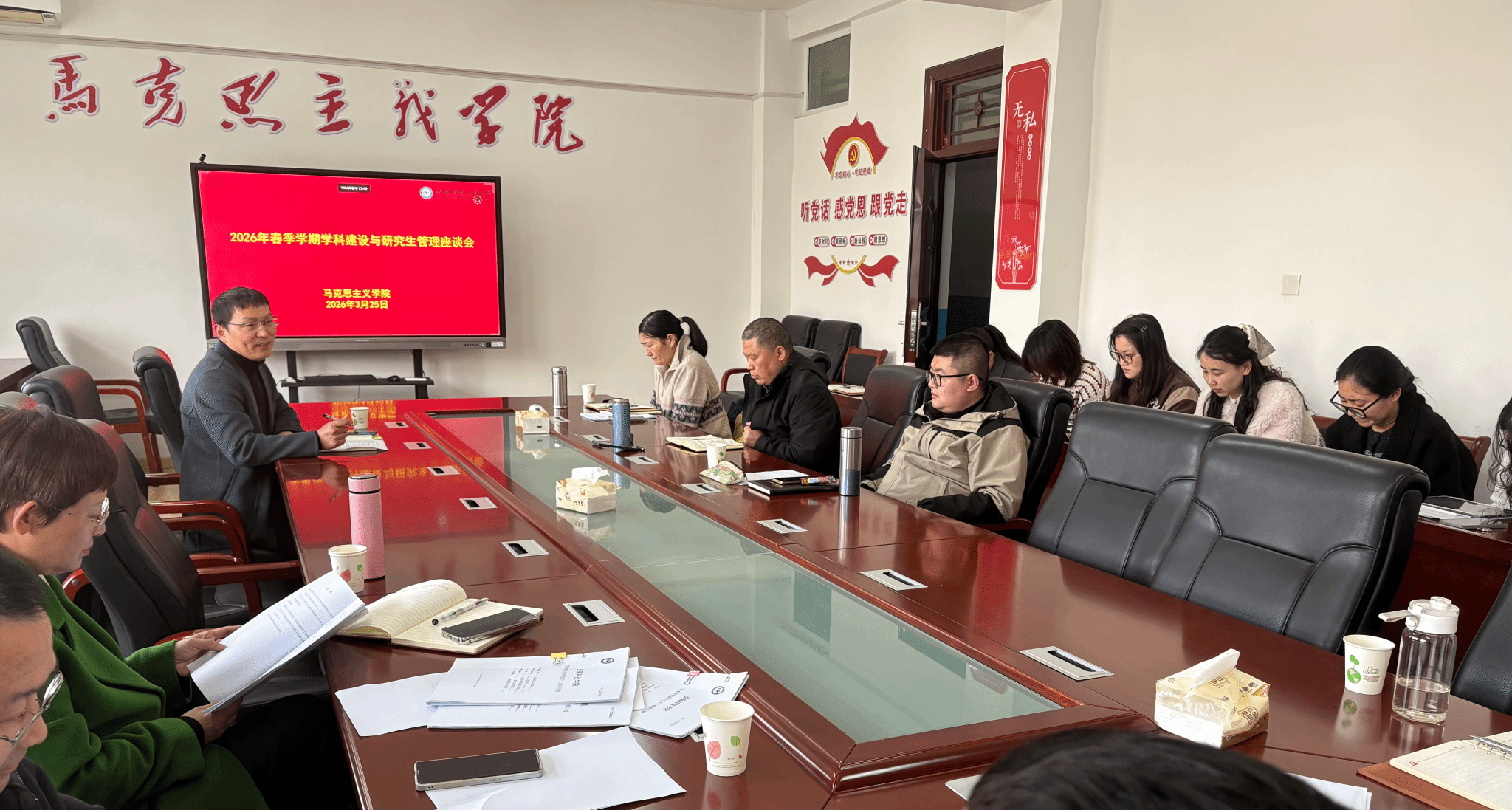 为进一步提升研究生培养质量,深化教育教学改革,扎实推进学科建设工作,3月26日,马克思主义学院召开2026年春季学期学科建设与研究生管理工作会议。会议由副院长张栋主持,全体研究生导师及硕士研究生参加会议。