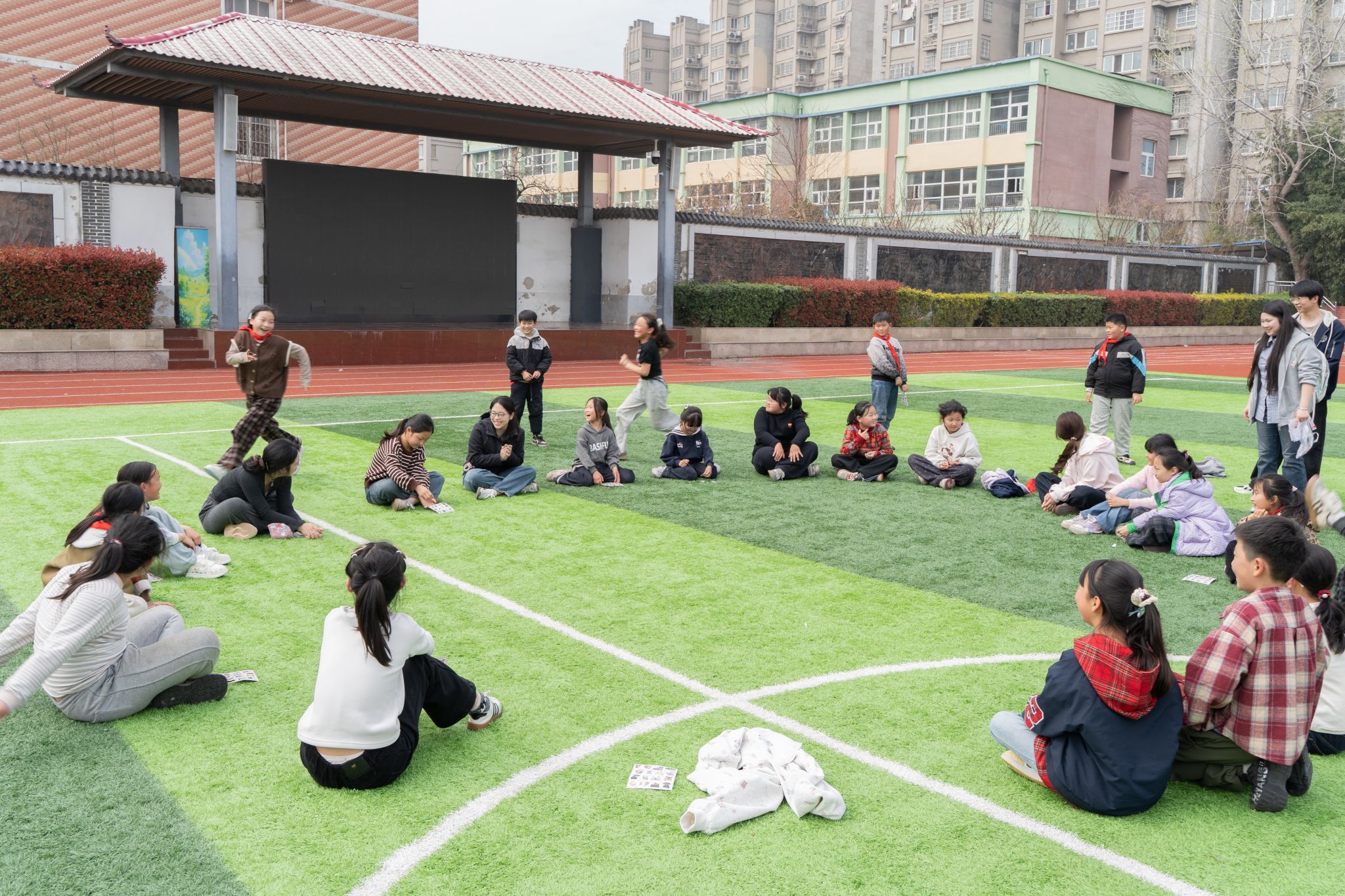 随后,支教队员带领孩子们前往操场,开展了数字抱团、沙包投掷、丢手绢等一系列趣味十足的户外活动。数字抱团环节中,孩子们紧盯指令、迅速组队,在默契配合中提升了专注力与协作能力;沙包游戏里,孩子们奔跑闪躲、欢声笑语,在运动中释放学习与生活的压力,传递着青春活力;丢手绢环节中,大家相互追逐、彼此包容,在轻松的氛围中学会友好互动、克服胆怯心理,收获了友谊与快乐。参与活动的同学纷纷表示,这次活动不仅让自己收获了满满的欢乐,更学会了如何表达情绪、与同伴友好相处。