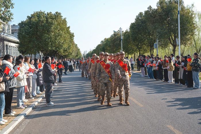 欢送会后,与会领导与广大师生夹道欢送即将出征的学子。新兵们身披鲜红绶带,胸戴大红花,精神抖擞,目光坚定,满载青春的梦想与热血,迈向保家卫国的光荣征程。