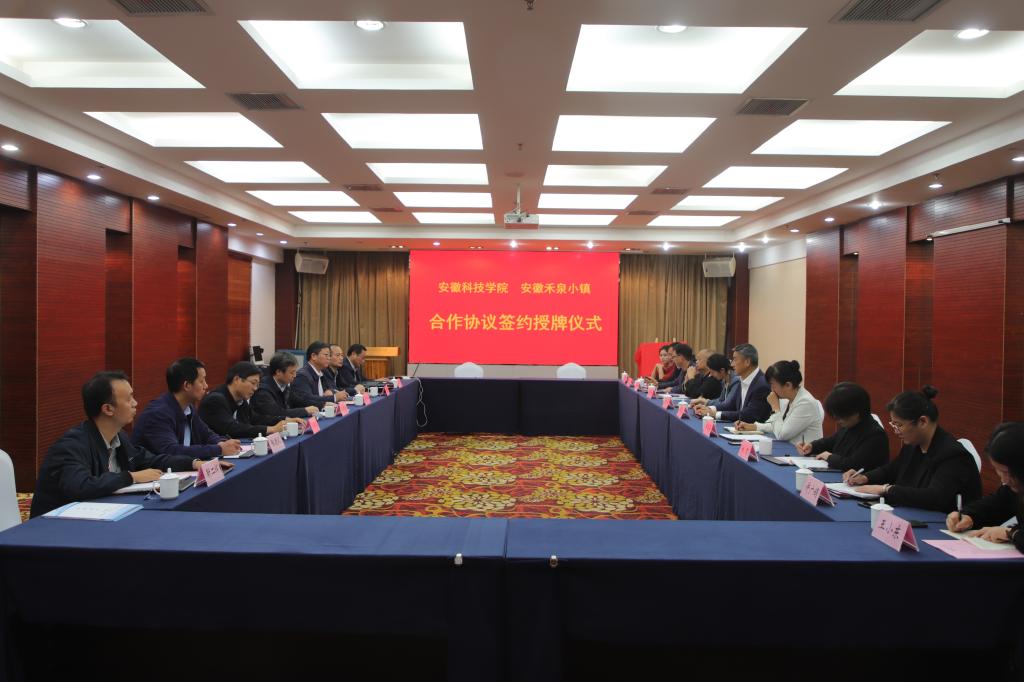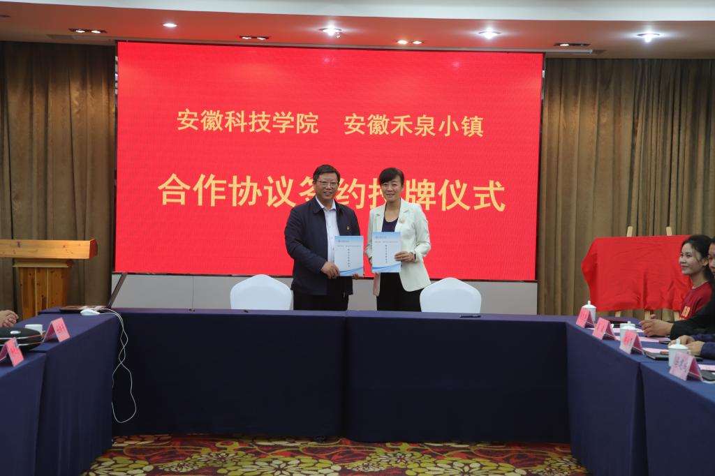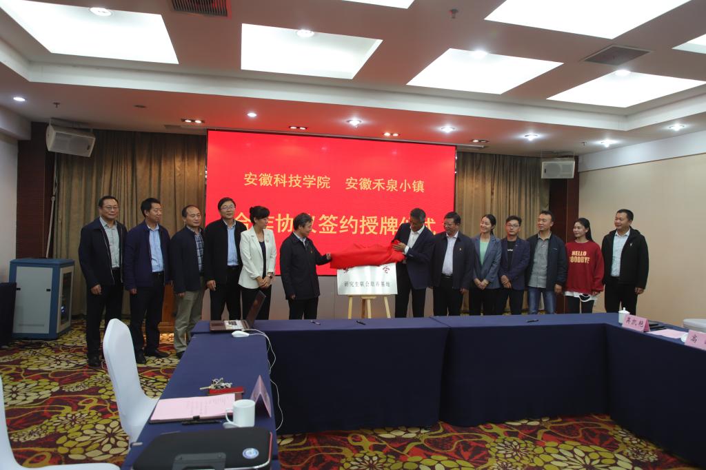 在热烈的掌声中,蒋德勤和蒋保安共同为安徽科技学院研究生联合培养基地揭牌。李升和、付莉莉代表安徽科技学院、安徽禾泉小镇分别签订了《安徽科技学院 安徽禾泉农庄生态农业有限公司校企合作协议》《安徽禾泉农庄生态农业有限公司 安徽科技学院小镇客厅项目合作协议》《安徽禾泉农庄生态农业有限公司 安徽科技学院产学研项目合作协议》。