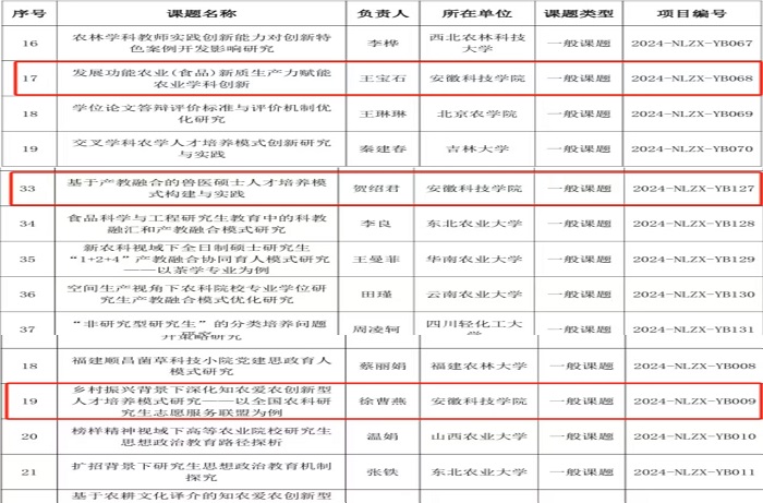 学校高度重视2024年研究课题立项工作,于2024年5月组织了“2024年研究课题”申报工作,经过资格审查、统筹协调后,将4个专项研究领域6项申报课题向中国学位与研究生教育学会农林学科工作委员会推荐,最终获批3项专项研究课题,其中思政类立项课题1项,学位学科类立项课题1项,综合类立项课题1项。